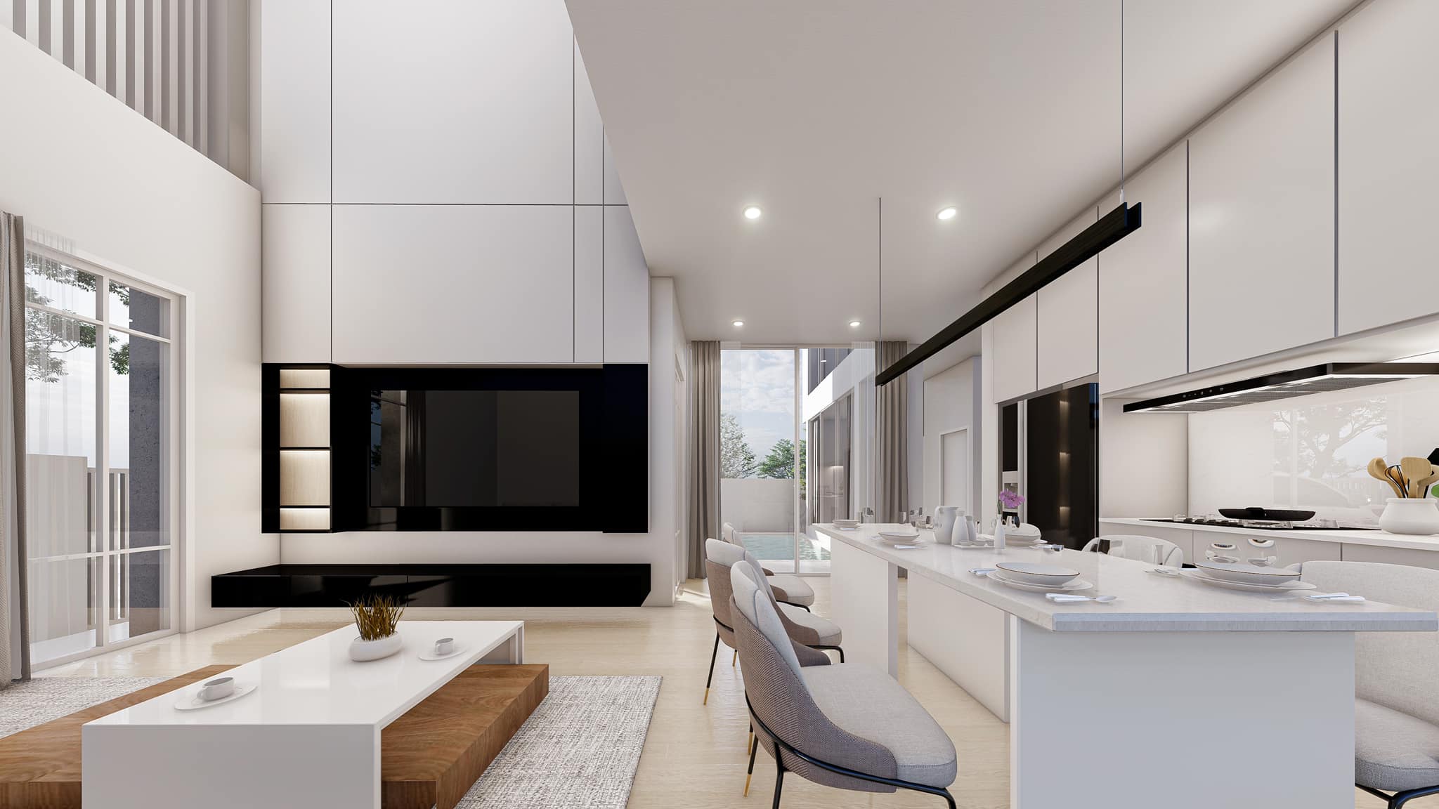 – ห้องนั่งเล่น Double Space เพดานสูง 7 เมตรโปร่งโล่งสบาย