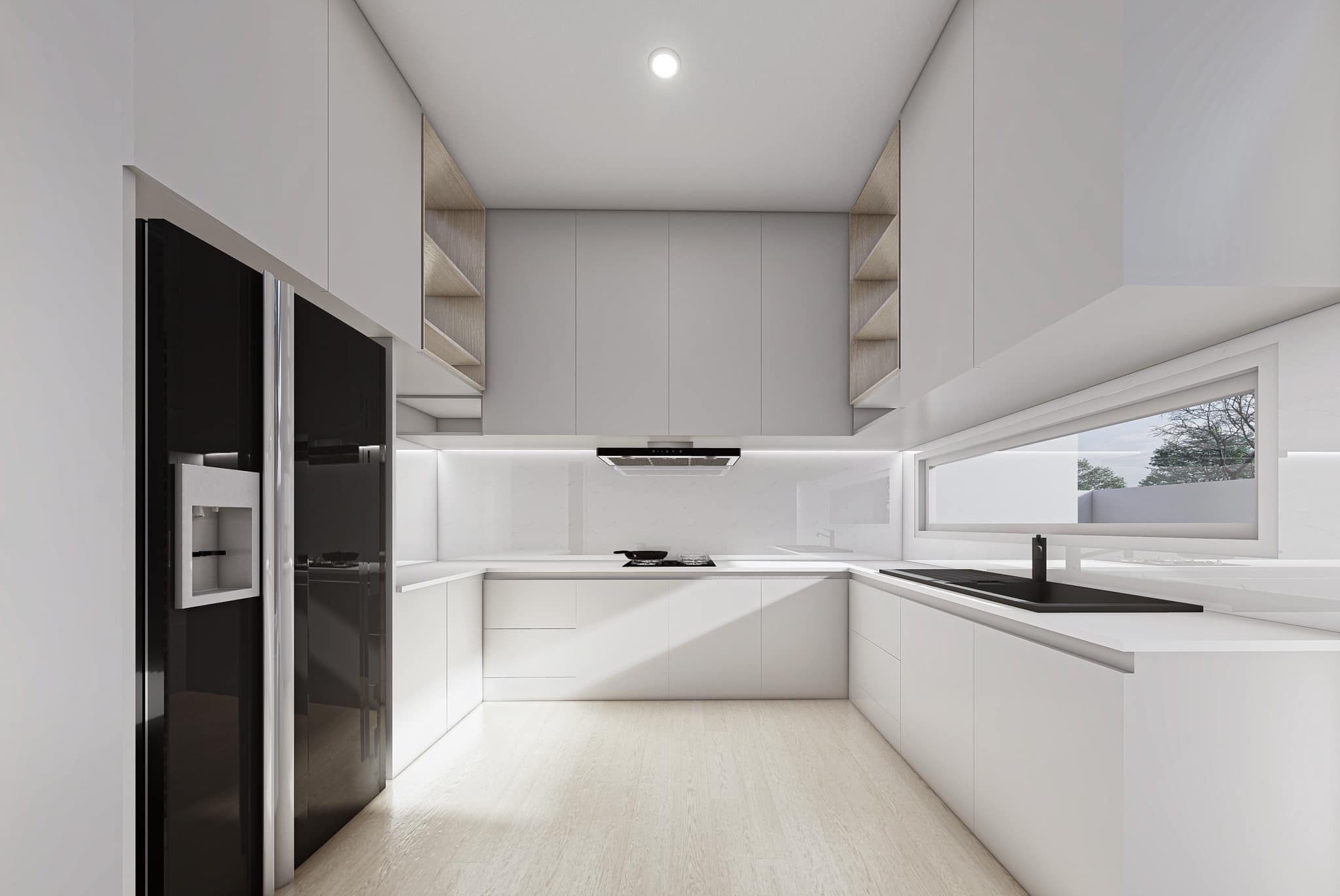 – ห้องครัวสไตล์โมเดิร์น มาพร้อมเคาน์เตอร์ครัว เตา และที่ดูดควัน